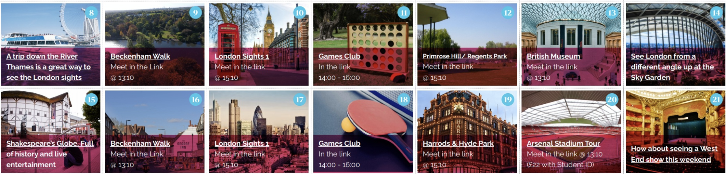 En dehors des heures de cours, l'école propose un programme d'activités sociales et culturelles gratuites ou payantes (et toujours facultatives). Il suffit de se rendre au bureau de la vie étudiante pour prendre des renseignements et s'inscrire. Voici un exemple de planning d'activités donné à titre indicatif :